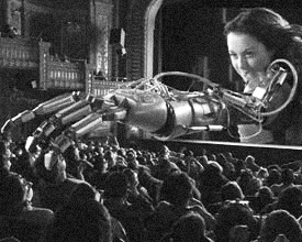 in some control room doing his best Wicked Witch of the West, peering